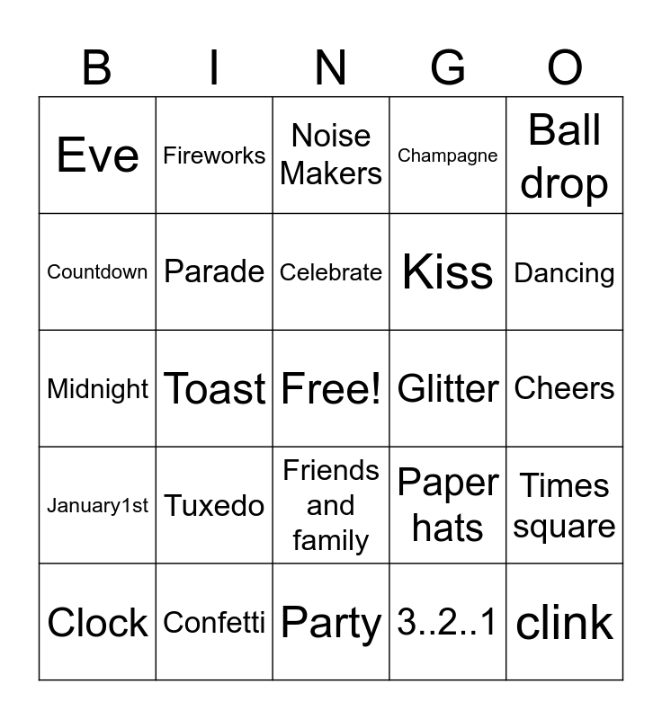 This bingo card has a free space and 24 words: Tuxedo, Confetti, Celebrate, Clock, Ball drop, Eve, Countdown, Fireworks, Glitter, Friends and family, Kiss, Midnight, Paper hats, Times square, Parade, 3..2..1, Cheers, Noise Makers, Dancing, Toast, clink, January1st, Champagne and Party.