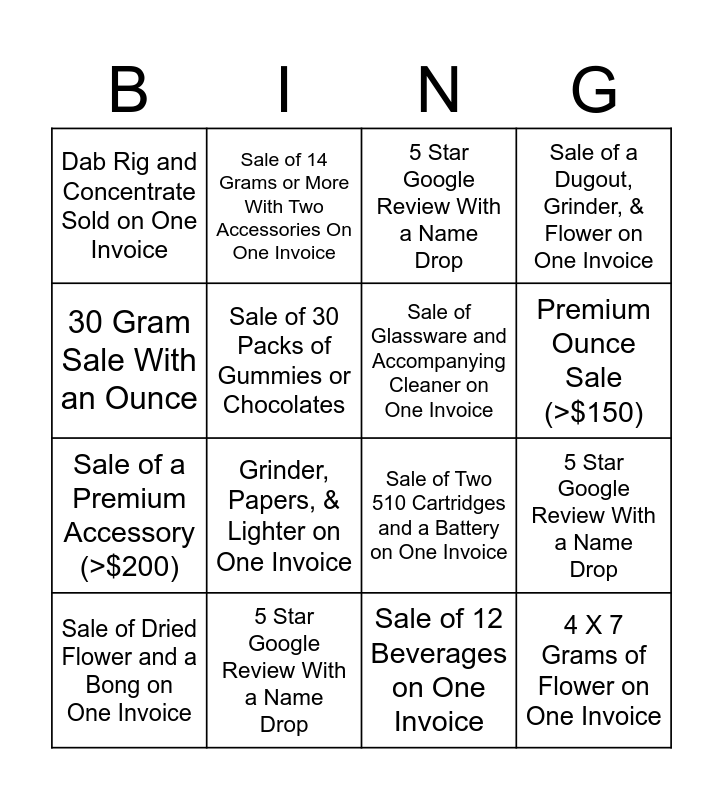 This bingo card has 16 words: 5 Star Google Review With a Name Drop, 5 Star Google Review With a Name Drop, 5 Star Google Review With a Name Drop, Dab Rig and Concentrate Sold on One Invoice, Sale of a Premium Accessory (>$200), Sale of 14 Grams or More With Two Accessories On One Invoice, Sale of Two 510 Cartridges and a Battery on One Invoice, Sale of 12 Beverages on One Invoice, 30 Gram Sale With an Ounce, Sale of 30 Packs of Gummies or Chocolates, Sale of Dried Flower and a Bong on One Invoice, Sale of a Dugout, Grinder, & Flower on One Invoice, Grinder, Papers, & Lighter on One Invoice, Premium Ounce Sale (>$150), Sale of Glassware and Accompanying Cleaner on One Invoice and 4 X 7 Grams of Flower on One Invoice.