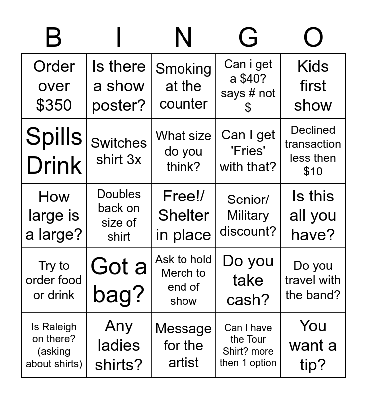 This bingo card has a free space and 27 words: Do you take cash?, Any Stickers or Pins?, Can I get 'Fries' with that?, Message for the artist, Spills Drink, Smoking at the counter, Is there a show poster?, Try to order food or drink, Senior/ Military discount?, Do you travel with the band?, How large is a large?, Can i get a $40? says # not $, Is Raleigh on there?(asking about shirts), Any ladies shirts?, Declined transaction less then $10, Transfers $$$ after ordering, Switches shirt 3x, What size do you think?, Got a bag?, Order over $350, Is this all you have?, Can I have the Tour Shirt? more then 1 option, Doubles back on size of shirt, You want a tip?, Ask to hold Merch to end of show, Kids first show and Got any Koozies.