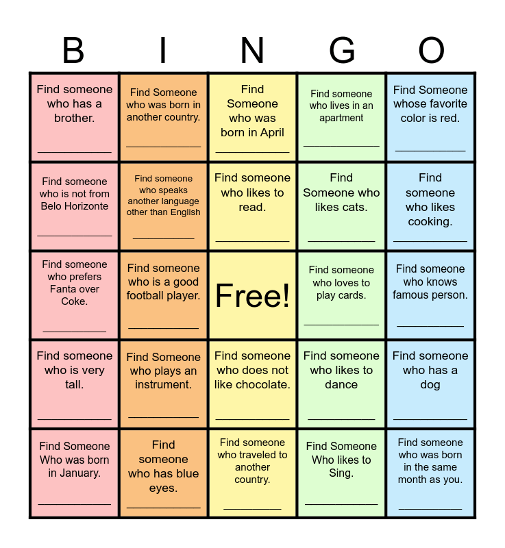 This bingo card has a free space and 25 words: Find Someone Who was born in January. ____________, Find Someone who plays an instrument. ___________, Find someone who likes to read. ___________, Find Someone Who likes to Sing. ____________, Find someone who likes cooking. ___________, Find someone who has a brother. ___________, Find Someone who was born in another country. _____________, Find Someone who was born in April ___________, Find Someone who likes cats. __________, Find someone who has a dog ___________, Find someone who prefers Fanta over Coke. ___________, Find someone who speaks another language other than English ____________, Find someone who likes to dance __________, Find someone who was born in the same month as you. ___________, Find someone who is not from Belo Horizonte _____________, Find someone who has blue eyes. ___________, Find someone who traveled to another country. __________, Find someone who lives in an apartment ______________, Find someone who knows famous person. ___________, Find someone who is very tall. ___________, Find someone who is a good football player. ___________, Find someone who does not like chocolate. ___________, Find someone who loves to play cards. _____________, Find Someone whose favorite color is red. ___________ and Find someone who is wearing a blue shirt. ____________.