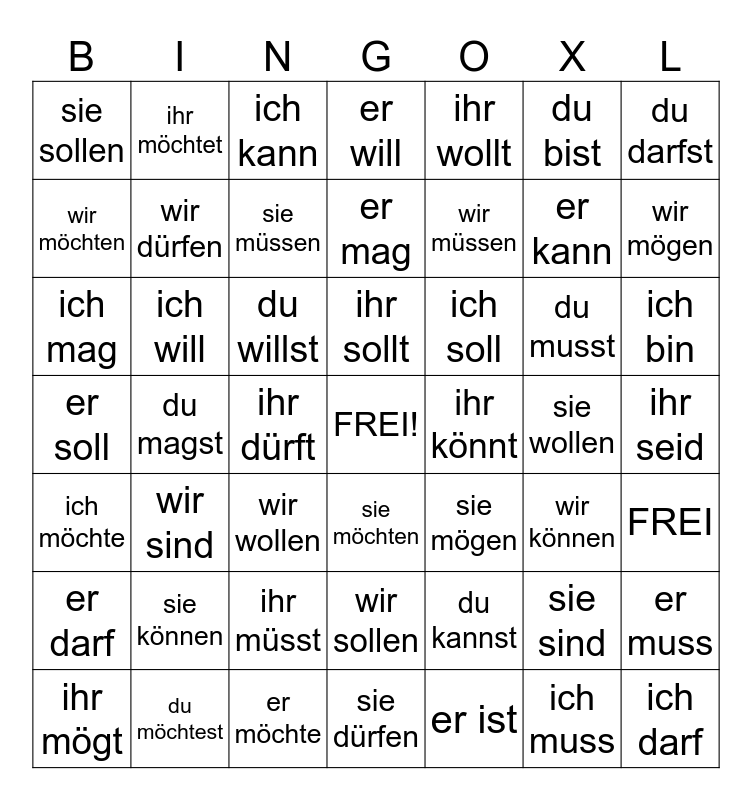 This bingo card has a free space and 48 words: ich möchte, du magst, er möchte, sie möchten, wir müssen, sie wollen, du darfst, ihr mögt, ich will, ihr dürft, er will, ihr wollt, du musst, ich bin, er soll, sie können, ich kann, ihr sollt, du kannst, du bist, wir mögen, wir möchten, ihr möchtet, sie müssen, er ist, er kann, ihr seid, er darf, wir sind, du willst, wir sollen, ich soll, sie sind, er muss, sie sollen, du möchtest, wir wollen, sie dürfen, ihr könnt, ich muss, FREI, ich mag, wir dürfen, ihr müsst, er mag, sie mögen, wir können and ich darf.