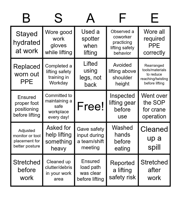 This bingo card has a free space and 24 words: Stretched before work, Asked for help lifting something heavy, Lifted using legs, not back, Reported a lifting safety risk, Wore all required PPE correctly, Stayed hydrated at work, Wore good work gloves while lifting, Used a spotter when lifting, Inspected lifting gear before use, Went over the SOP for crane operation, Ensured proper foot positioning before lifting, Completed a lifting safety training in Workday, Washed hands before eating, Cleaned up a spill, Replaced worn out PPE, Cleaned up clutter/debris in your work area, Ensured load path was clear before lifting, Observed a coworker practicing lifting safety behavior, Rearranged tools/materials to reduce reaching/twisting before lifting, Adjusted monitor or tool placement for better posture, Committed to maintaining a safe workplace every day!, Gave safety input during a team/shift meeting, Avoided lifting above shoulder height and Stretched after work.