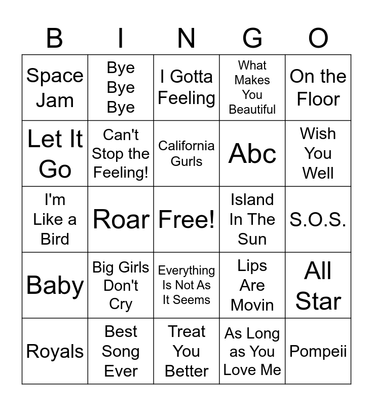 This bingo card has a free space and 59 words: Better When I'm Dancin', Best Song Ever, Firework, Baby, As Long as You Love Me, Bad Blood, Can't Stop the Feeling!, 7 Years, Abc, Story of My Life, What Makes You Beautiful, Good Feeling, Let It Go, How Far I'll Go, There's Nothing Holdin' Me Back, Space Jam, Pompeii, On the Floor, It's Time, California Gurls, Island In The Sun, I Gotta Feeling, Royals, All Star, Dynamite, Party In The U.S.A., Hey There Delilah, Radioactive, Wish You Well, Me And My Broken Heart, Beautiful, Bang!, Intergalactic, Poison, Bye Bye Bye, Ooh Ahh (My Life Be Like), ...Ready For It?, Roar, Love Yourself, I'm Like a Bird, Cake By The Ocean, Big Girls Don't Cry, S.O.S., Where Is The Love?, Stickwitu, Year 3000, Today is Gonna be a Great Day, So Far So Great, Everything Is Not As It Seems, Treat You Better, Bubbly, Born This Way, A Thousand Miles, All Rise, Apologize, Lips Are Movin, Shut Up and Dance, Timber and Best Day Of My Life.