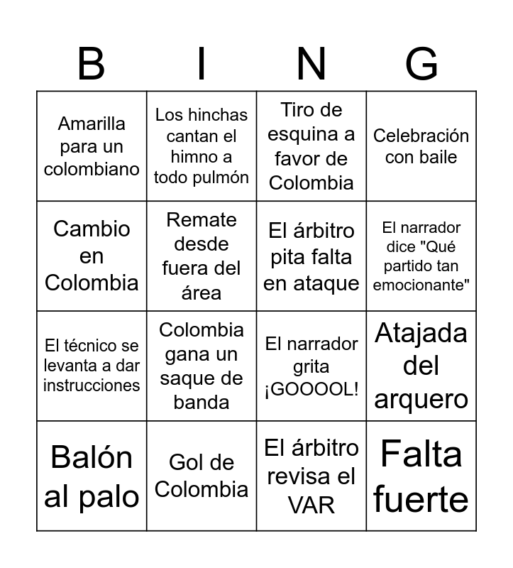 This bingo card has 16 words: Gol de Colombia, Atajada del arquero, Tiro de esquina a favor de Colombia, Amarilla para un colombiano, El técnico se levanta a dar instrucciones, Los hinchas cantan el himno a todo pulmón, El narrador grita ¡GOOOOL!, El árbitro revisa el VAR, Cambio en Colombia, Remate desde fuera del área, Balón al palo, Celebración con baile, Colombia gana un saque de banda, El narrador dice "Qué partido tan emocionante", El árbitro pita falta en ataque and Falta fuerte.