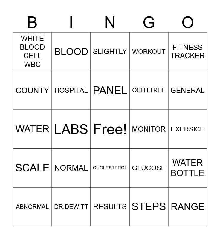 This bingo card has a free space and 24 words: NORMAL, DR.DEWITT, PANEL, ABNORMAL, FITNESS TRACKER, WHITE BLOOD CELL WBC, COUNTY, BLOOD, MONITOR, CHOLESTEROL, OCHILTREE, WATER, GLUCOSE, WATER BOTTLE, HOSPITAL, STEPS, EXERSICE, SLIGHTLY, GENERAL, LABS, RANGE, SCALE, WORKOUT and RESULTS.