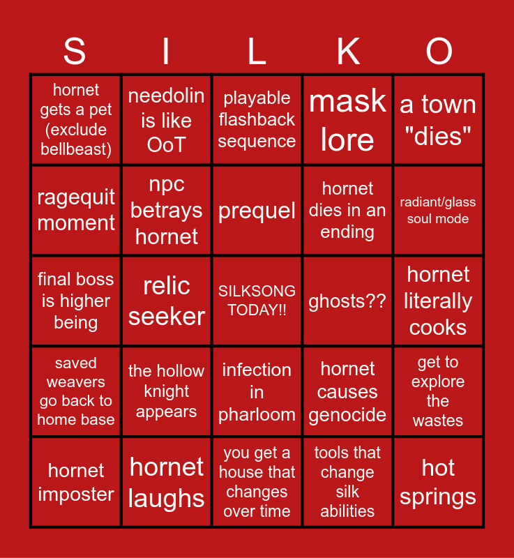 This bingo card has a free space and 24 words: the hollow knight appears, hornet laughs, prequel, hornet imposter, a town "dies", hornet gets a pet (exclude bellbeast), ragequit moment, needolin is like OoT, ghosts??, infection in pharloom, hornet dies in an ending, final boss is higher being, hornet causes genocide, get to explore the wastes, npc betrays hornet, tools that change silk abilities, hornet literally cooks, playable flashback sequence, radiant/glass soul mode, relic seeker, hot springs, saved weavers go back to home base, mask lore and you get a house that changes over time.