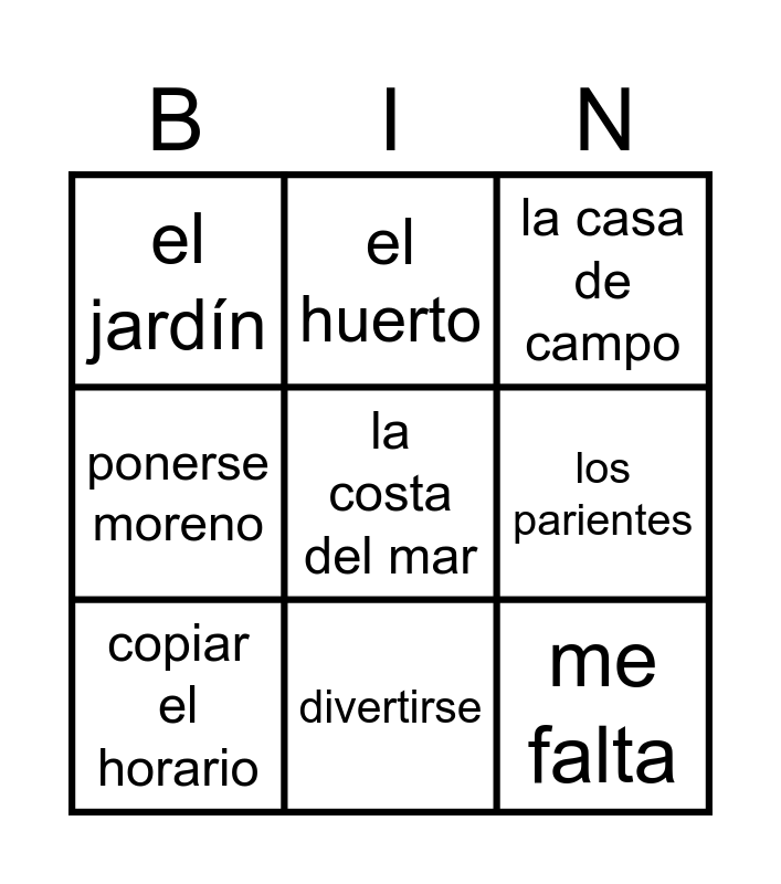 This bingo card has 9 words: copiar el horario, la casa de campo, el huerto, ponerse moreno, el jardín, los parientes, la costa del mar, me falta and divertirse.