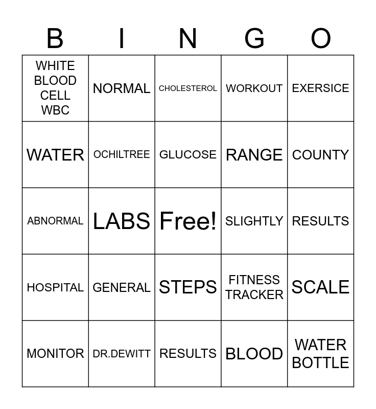 This bingo card has a free space and 24 words: GENERAL, DR.DEWITT, GLUCOSE, MONITOR, EXERSICE, WHITE BLOOD CELL WBC, WATER, NORMAL, SLIGHTLY, STEPS, RANGE, ABNORMAL, FITNESS TRACKER, SCALE, OCHILTREE, BLOOD, RESULTS, CHOLESTEROL, COUNTY, LABS, WATER BOTTLE, HOSPITAL, WORKOUT and RESULTS.