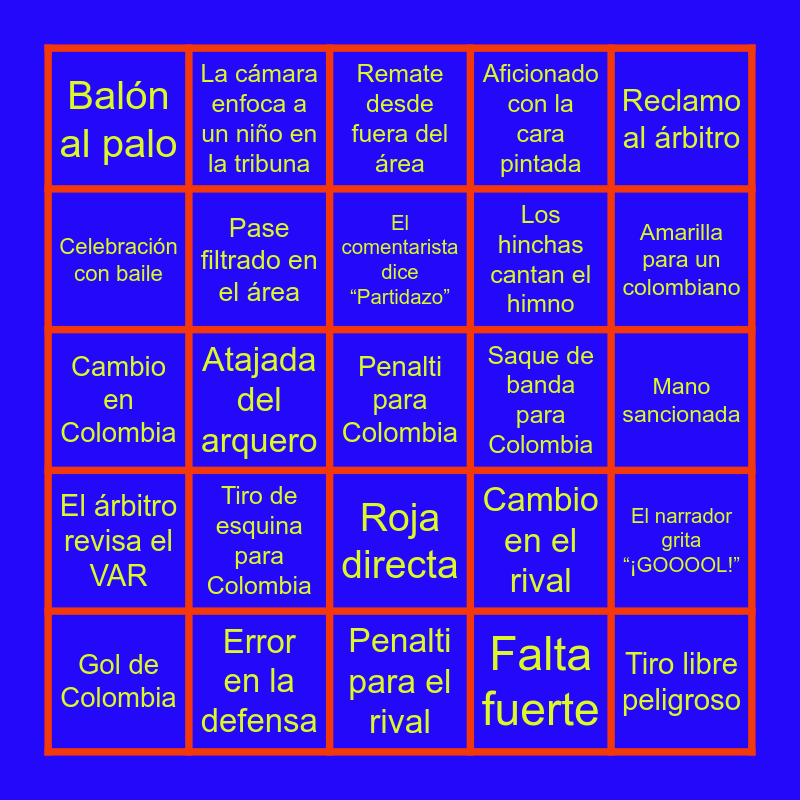 This bingo card has 29 words: Gol de Colombia, Gol del rival, Atajada del arquero, Tiro libre peligroso, Balón al palo, Remate desde fuera del área, Pase filtrado en el área, Tiro de esquina para Colombia, Saque de banda para Colombia, Error en la defensa, Mano sancionada, Penalti para Colombia, Penalti para el rival, Falta fuerte, Amarilla para un colombiano, Amarilla para el rival, Roja directa, El árbitro revisa el VAR, Reclamo al árbitro, Cambio en Colombia, Cambio en el rival, La cámara muestra a la hinchada C🇴lombiana, Los hinchas cantan el himno, Celebración con baile, Aficionado con la cara pintada, La cámara enfoca a un niño en la tribuna, El narrador grita “¡GOOOOL!”, El comentarista dice “Partidazo” and Repetición en cámara lenta.