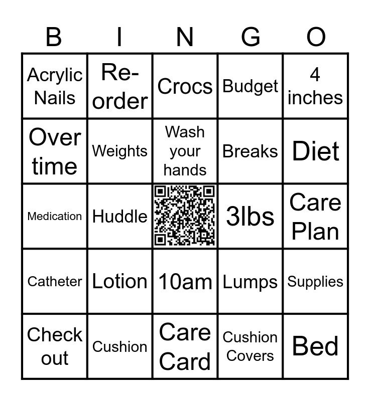 This bingo card has a free space and 30 words: Cushion, Success, Huddle, Team, Acrylic Nails, Crocs, Weights, 10am, 3lbs, Care Card, Care Plan, Bed, Cushion Covers, Wheelchair, Diet, Dime, Lumps, Catheter, Lotion, 4 inches, Medication, Open Date, Re-order, Breaks, Over time, Budget, Supplies, Check out, Wash your hands and Be Kind.