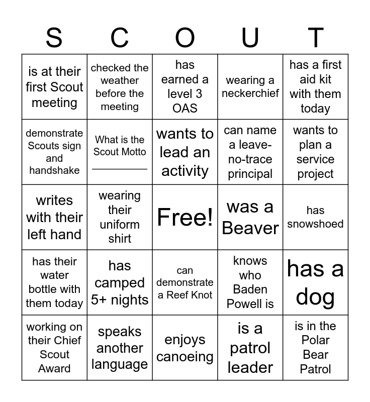 This bingo card has a free space and 29 words: working on their Chief Scout Award, went to Scoutlook, wearing their uniform shirt, famous person who was a Scout __________, is at their first Scout meeting, has earned a level 3 OAS, What is the Scout Motto __________, has camped 5+ nights, was a Beaver, speaks another language, has snowshoed, is in the Polar Bear Patrol, enjoys canoeing, is a patrol leader, wants to plan a service project, can whistle, can demonstrate a Reef Knot, has their water bottle with them today, has a first aid kit with them today, writes with their left hand, knows who Baden Powell is, knows what Brownsea Island is, can name a leave-no-trace principal, demonstrate Scouts sign and handshake, wearing a neckerchief, checked the weather before the meeting, has a dog, wants to lead an activity and wearing hiking boots/shoes.
