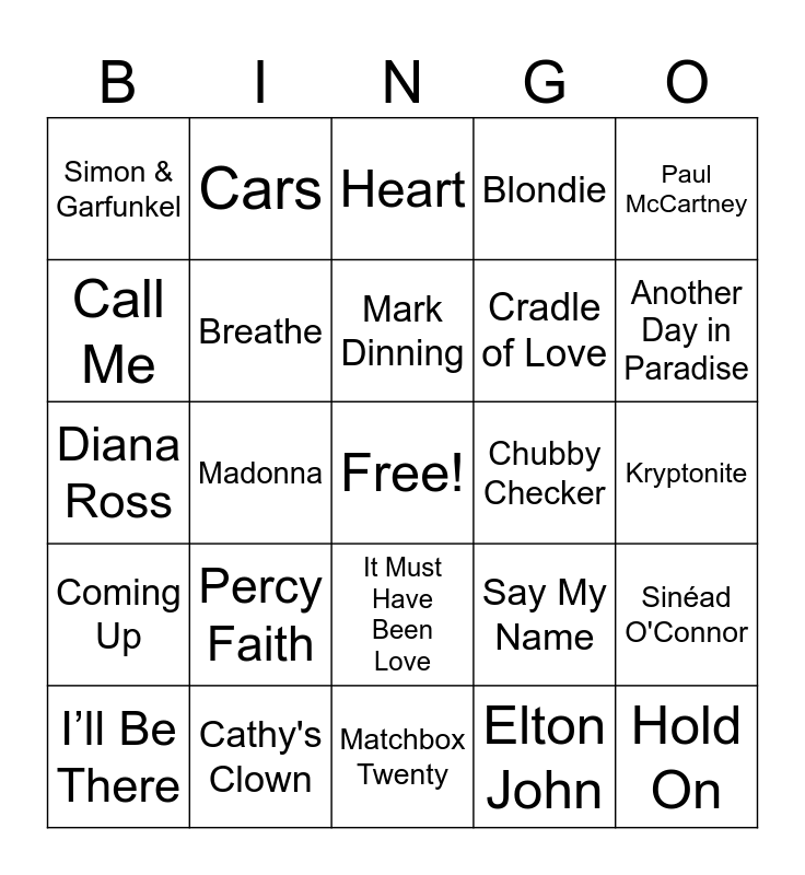 This bingo card has a free space and 24 words: Percy Faith, Cathy's Clown, Mark Dinning, I’ll Be There, Paul McCartney, Simon & Garfunkel, Call Me, Cars, Chubby Checker, It Must Have Been Love, Cradle of Love, Diana Ross, Say My Name, Sinéad O'Connor, Breathe, Elton John, Kryptonite, Heart, Another Day in Paradise, Madonna, Hold On, Coming Up, Blondie and Matchbox Twenty.