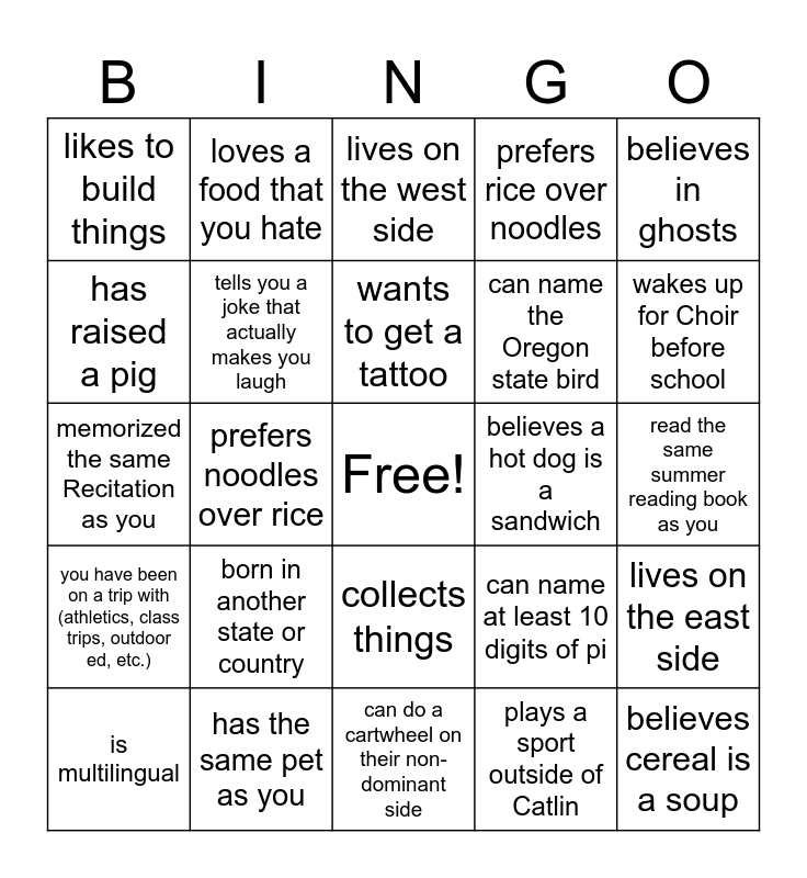This bingo card has a free space and 24 words: born in another state or country, has the same pet as you, wants to get a tattoo, is multilingual, believes in ghosts, likes to build things, has raised a pig, loves a food that you hate, believes a hot dog is a sandwich, collects things, can name the Oregon state bird, memorized the same Recitation as you, can name at least 10 digits of pi, lives on the east side, tells you a joke that actually makes you laugh, plays a sport outside of Catlin, read the same summer reading book as you, lives on the west side, wakes up for Choir before school, prefers noodles over rice, believes cereal is a soup, you have been on a trip with (athletics, class trips, outdoor ed, etc.), prefers rice over noodles and can do a cartwheel on their non-dominant side.