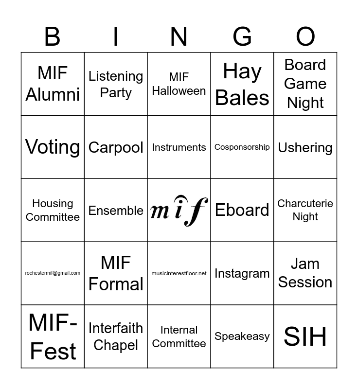 This bingo card has a free space and 44 words: Wilder, SIH, MIF Practice Room, MIF-Fest, MIFgiving, Speakeasy, MIF Halloween, Milk Monday, Board Game Night, Interfaith Chapel, Hay Bales, Eboard, musicinterestfloor.net, MIF Formal, CCC, Internal Committee, External Committee, Housing Committee, Interview, Ushering, Listening Party, On-Floor, Off-Floor, MIF Alumni, 1976, Charcuterie Night, Spoons, Fundraiser, Instagram, rochestermif@gmail.com, Concert, Jam Session, MIFlympics, Discord, Ensemble, MIF Mural, GMM, Music, Instruments, Voting, Cosponsorship, Application, Carpool and Suite.