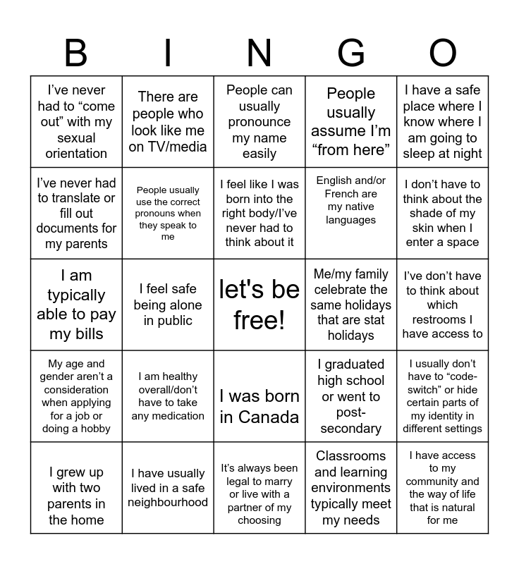 This bingo card has a free space and 24 words: I am healthy overall/don’t have to take any medication, I have usually lived in a safe neighbourhood, I feel like I was born into the right body/I’ve never had to think about it, I grew up with two parents in the home, I have a safe place where I know where I am going to sleep at night, I’ve never had to “come out” with my sexual orientation, I’ve never had to translate or fill out documents for my parents, There are people who look like me on TV/media, Me/my family celebrate the same holidays that are stat holidays, I was born in Canada, English and/or French are my native languages, I am typically able to pay my bills, I graduated high school or went to post-secondary, I usually don’t have to “code-switch” or hide certain parts of my identity in different settings, People usually use the correct pronouns when they speak to me, Classrooms and learning environments typically meet my needs, I’ve don’t have to think about which restrooms I have access to, People can usually pronounce my name easily, I don’t have to think about the shade of my skin when I enter a space, I feel safe being alone in public, I have access to my community and the way of life that is natural for me, My age and gender aren’t a consideration when applying for a job or doing a hobby, People usually assume I’m “from here” and It’s always been legal to marry or live with a partner of my choosing.