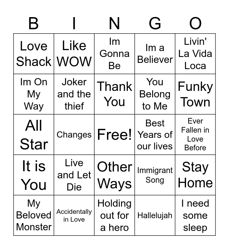 This bingo card has a free space and 28 words: Stay Home, Bad Reputation, You Belong to Me, Hallelujah, Im On My Way, Im Gonna Be, Like WOW, It is You, Best Years of our lives, My Beloved Monster, All Star, Im a Believer, Accidentally in Love, Holding out for a hero, Funky Town, Barracuda, Live and Let Die, Joker and the thief, Thank You, Other Ways, Love Shack, Dont want to think about you, I need some sleep, Changes, Ever Fallen in Love Before, Immigrant Song, Livin' La Vida Loca and Best Days.