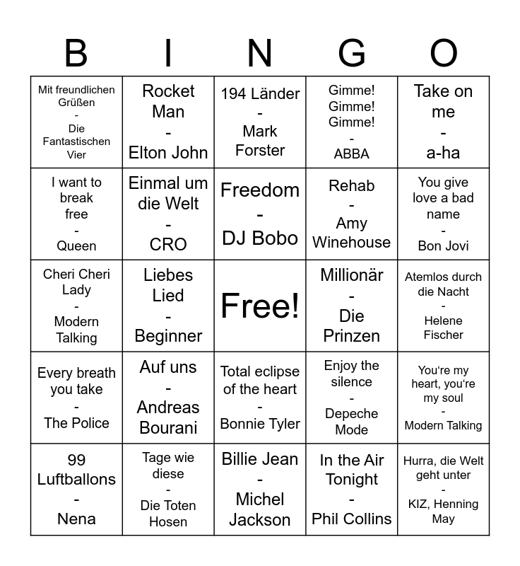 This bingo card has a free space and 29 words: 99 Luftballons - Nena, Perfekte Welle - Juli, Liebes Lied - Beginner, Bilder im Kopf - Sido, Mit freundlichen Grüßen - Die Fantastischen Vier, 194 Länder - Mark Forster, Einmal um die Welt - CRO, Auf uns - Andreas Bourani, Millionär - Die Prinzen, Tage wie diese - Die Toten Hosen, Atemlos durch die Nacht - Helene Fischer, Hurra, die Welt geht unter - KIZ, Henning May, Billie Jean - Michel Jackson, In the Air Tonight - Phil Collins, You give love a bad name - Bon Jovi, Big in Japan - Alphaville, Total eclipse of the heart - Bonnie Tyler, Every breath you take - The Police, Take on me - a-ha, Cheri Cheri Lady - Modern Talking, Enjoy the silence - Depeche Mode, I‘m still standing - Elton John, Rehab - Amy Winehouse, I want to break free - Queen, Gimme! Gimme! Gimme! - ABBA, Rocket Man - Elton John, You‘re my heart, you‘re my soul - Modern Talking, Freedom - DJ Bobo and Get up, stand up - Bob Marley.