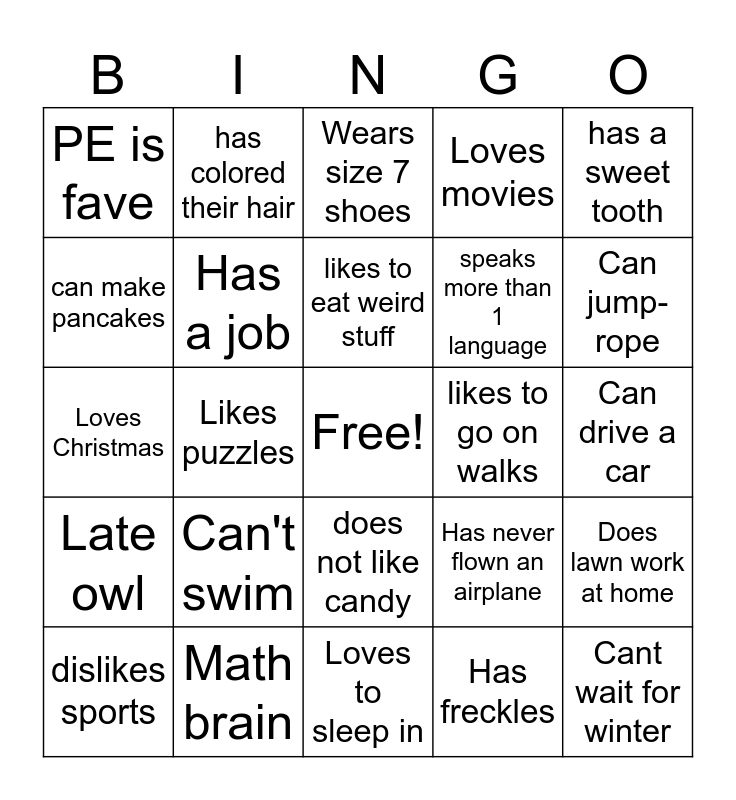 This bingo card has a free space and 25 words: Can't swim, Loves to sleep in, likes to eat weird stuff, dislikes sports, has a sweet tooth, PE is fave, can make pancakes, has colored their hair, likes to go on walks, does not like candy, speaks more than 1 language, Loves Christmas, Has never flown an airplane, Does lawn work at home, Has a job, Forest Frank is the best, Can drive a car, Wears size 7 shoes, Can jump-rope, Likes puzzles, Cant wait for winter, Math brain, Late owl, Loves movies and Has freckles.