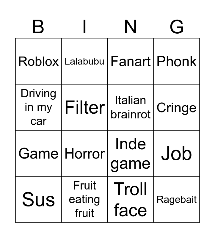 This bingo card has 19 words: Inde game, Forsaken, Fanart, Ragebait, Job, Driving in my car, Troll face, Roblox, Lalabubu, Game, Horror, Filter, Italian brainrot, Fruit eating fruit, Sus, Ai, Phonk, Cringe and Cold edit.