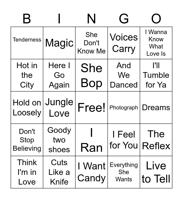 This bingo card has a free space and 24 words: Goody two shoes, Cuts Like a Knife, She Bop, Think I'm in Love, I Wanna Know What Love Is, Tenderness, Hot in the City, Magic, Photograph, I Ran, And We Danced, Hold on Loosely, I Feel for You, The Reflex, Here I Go Again, Everything She Wants, Dreams, She Don't Know Me, I'll Tumble for Ya, Jungle Love, Live to Tell, Don't Stop Believing, Voices Carry and I Want Candy.