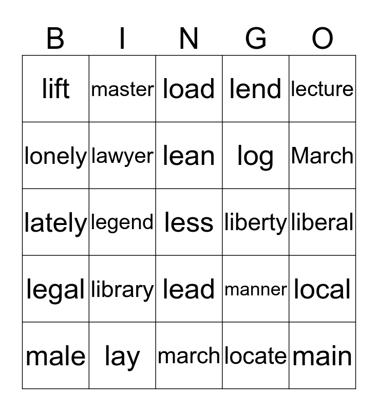 This bingo card has 40 words: language, lately, laundry, lawyer, lay, lead, lean, least, lecture, legal, legend, lend, less, liberal, liberty, library, lie, lift, limit, load, local, locate, log, lonely, loose, loud, luck, mail, main, maintain, majority, male, mammal, manner, March, march, mark, Mars, master and match.