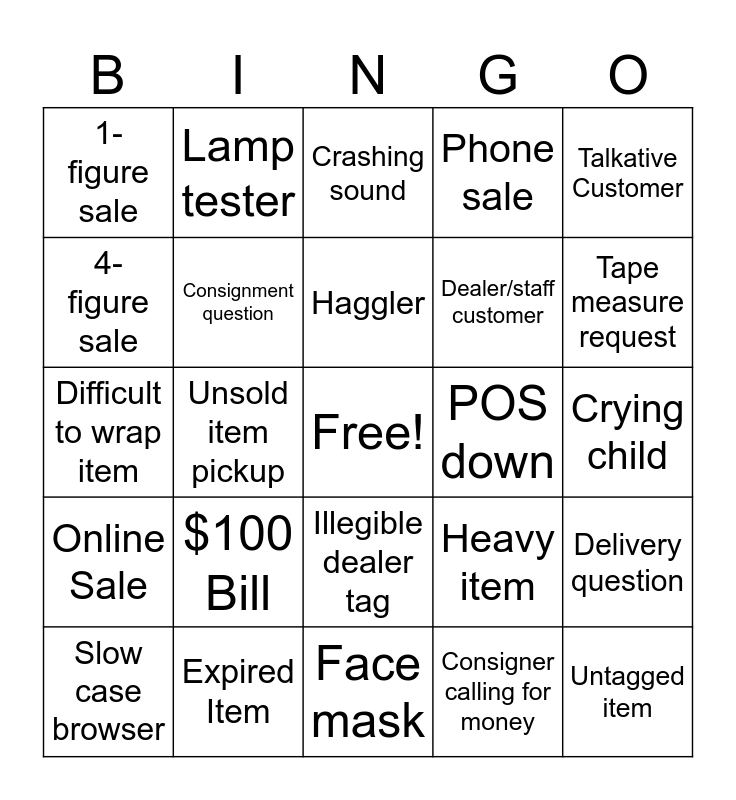 This bingo card has a free space and 24 words: $100 Bill, Expired Item, Haggler, Slow case browser, Talkative Customer, 1-figure sale, 4-figure sale, Lamp tester, POS down, Illegible dealer tag, Dealer/staff customer, Difficult to wrap item, Heavy item, Delivery question, Consignment question, Consigner calling for money, Crying child, Crashing sound, Tape measure request, Unsold item pickup, Untagged item, Online Sale, Phone sale and Face mask.