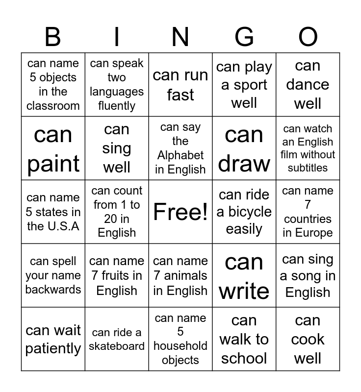 This bingo card has a free space and 24 words: can name 7 fruits in English, can ride a skateboard, can say the Alphabet in English, can wait patiently, can dance well, can name 5 objects in the classroom, can paint, can speak two languages fluently, can ride a bicycle easily, can name 7 animals in English, can draw, can name 5 states in the U.S.A, can write, can sing a song in English, can sing well, can walk to school, can name 7 countries in Europe, can run fast, can watch an English film without subtitles, can count from 1 to 20 in English, can cook well, can spell your name backwards, can play a sport well and can name 5 household objects.