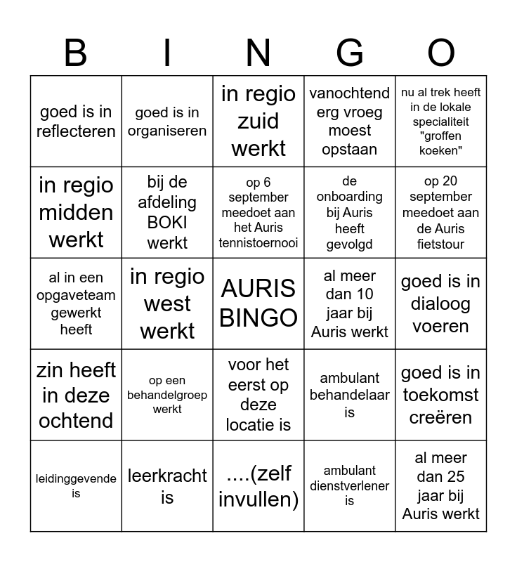 This bingo card has a free space and 24 words: op een behandelgroep werkt, leerkracht is, op 6 september meedoet aan het Auris tennistoernooi, leidinggevende is, nu al trek heeft in de lokale specialiteit "groffen koeken", goed is in reflecteren, in regio midden werkt, goed is in organiseren, al meer dan 10 jaar bij Auris werkt, voor het eerst op deze locatie is, de onboarding bij Auris heeft gevolgd, al in een opgaveteam gewerkt heeft, ambulant behandelaar is, goed is in toekomst creëren, bij de afdeling BOKI werkt, ambulant dienstverlener is, goed is in dialoog voeren, in regio zuid werkt, op 20 september meedoet aan de Auris fietstour, in regio west werkt, al meer dan 25 jaar bij Auris werkt, zin heeft in deze ochtend, vanochtend erg vroeg moest opstaan and ....(zelf invullen).