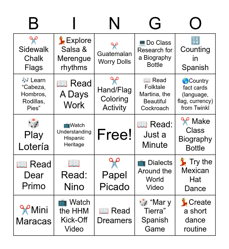 This bingo card has 2 images, a free space and 24 words: 📖Read: Nino, 📺 Watch the HHM Kick-Off Video, ✂️Hand/Flag Coloring Activity, ✂️Mini Maracas, 🔢 Counting in Spanish, ✂️Sidewalk Chalk Flags, 🎶 Learn “Cabeza, Hombros, Rodillas, Pies”, 💃Explore Salsa & Merengue rhythms, 📖 Read: Just a Minute, ✂️ Papel Picado, 📖 Read Folktale Martina, the Beautiful Cockroach, 🎲 Play Lotería, 📺 Dialects Around the World Video, 💃 Try the Mexican Hat Dance, 📖 Read A Days Work, 🎲 “Mar y Tierra” Spanish Game, ✂️ Make Class Biography Bottle, ✂️Guatemalan Worry Dolls, 🌎Country fact cards (language, flag, currency) from Twinkl, 📺Watch Understanding Hispanic Heritage, 💃Create a short dance routine, 📖 Read Dear Primo, 💻Do Class Research for a Biography Bottle and 📖 Read Dreamers.