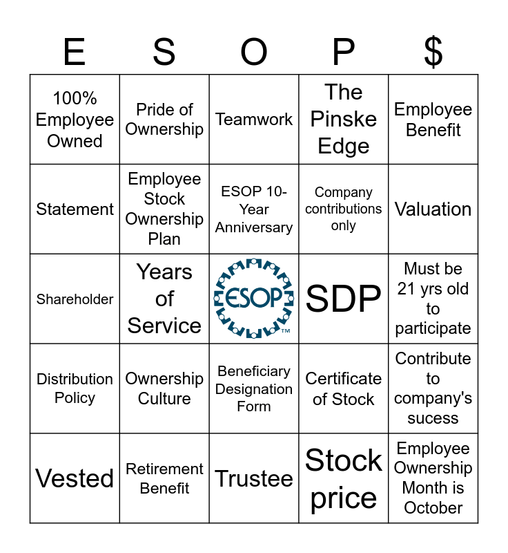 This bingo card has a free space and 29 words: Vested, Owner, Years of Service, Pride of Ownership, 100% Employee Owned, Teamwork, Employee Stock Ownership Plan, Ownership Culture, SDP, Retirement Benefit, Must be 21 yrs old to participate, Employee Ownership Month is October, Trustee, Stock price, Valuation, $55.76 Stock Price in 2023, Beneficiary Designation Form, Distribution Policy, Employee Benefit, Shareholder, Certificate of Stock, 1000 hours of service per year, Company contributions only, Statement, The Pinske Edge, Pride of Ownership, Contribute to company's sucess, ESOP 10-Year Anniversary and Benefit Payment.