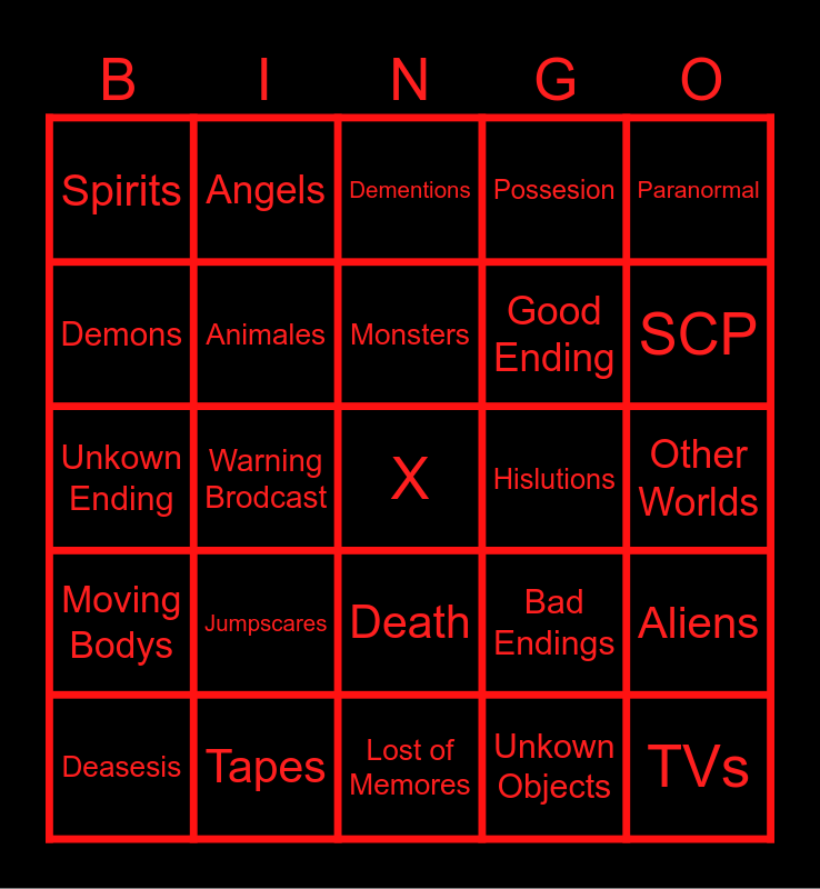 This bingo card has a free space and 24 words: Jumpscares, Tapes, Monsters, Deasesis, Paranormal, Spirits, Demons, Angels, Hislutions, Death, Good Ending, Unkown Ending, Bad Endings, Aliens, Animales, Unkown Objects, Other Worlds, Dementions, SCP, Warning Brodcast, TVs, Moving Bodys, Possesion and Lost of Memores.