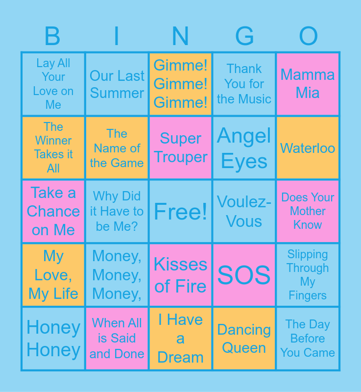 This bingo card has a free space and 24 words: Honey Honey, Money, Money, Money,, Super Trouper, Dancing Queen, Mamma Mia, Lay All Your Love on Me, Our Last Summer, Gimme! Gimme! Gimme!, Voulez- Vous, Does Your Mother Know, Take a Chance on Me, The Name of the Game, SOS, Slipping Through My Fingers, The Winner Takes it All, When All is Said and Done, I Have a Dream, Thank You for the Music, Waterloo, My Love, My Life, Why Did it Have to be Me?, Kisses of Fire, Angel Eyes and The Day Before You Came.