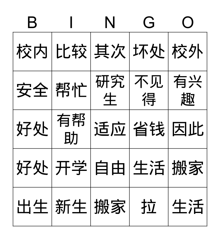 This bingo card has a free space and 24 words: 开学, 新生, 研究生, 出生, 校外, 校内, 安全, 比较, 省钱, 自由, 不见得, 好处, 生活, 搬家, 帮忙, 拉, 因此, 其次, 有兴趣, 有帮助, 生活, 好处, 坏处 and 搬家.