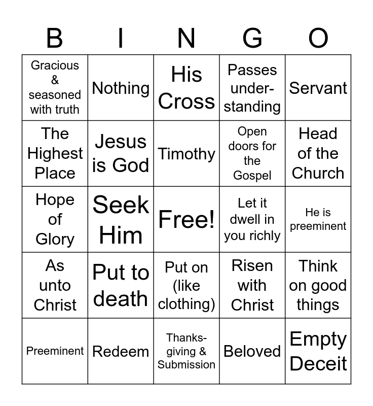 This bingo card has a free space and 29 words: Preeminent, Complete in Christ, Seek Him, God's judgment, Gracious & seasoned with truth, His Cross, Jesus is God, Put to death, Let it dwell in you richly, Redeem, He is preeminent, Empty Deceit, Thanks-giving & Submission, Beloved, Head of the Church, Keep Him as Head, Put on (like clothing), As unto Christ, Servant, Hope of Glory, Risen with Christ, Christ, Open doors for the Gospel, The Highest Place, Passes under-standing, Nothing, Think on good things, Timothy and Epaphroditus.