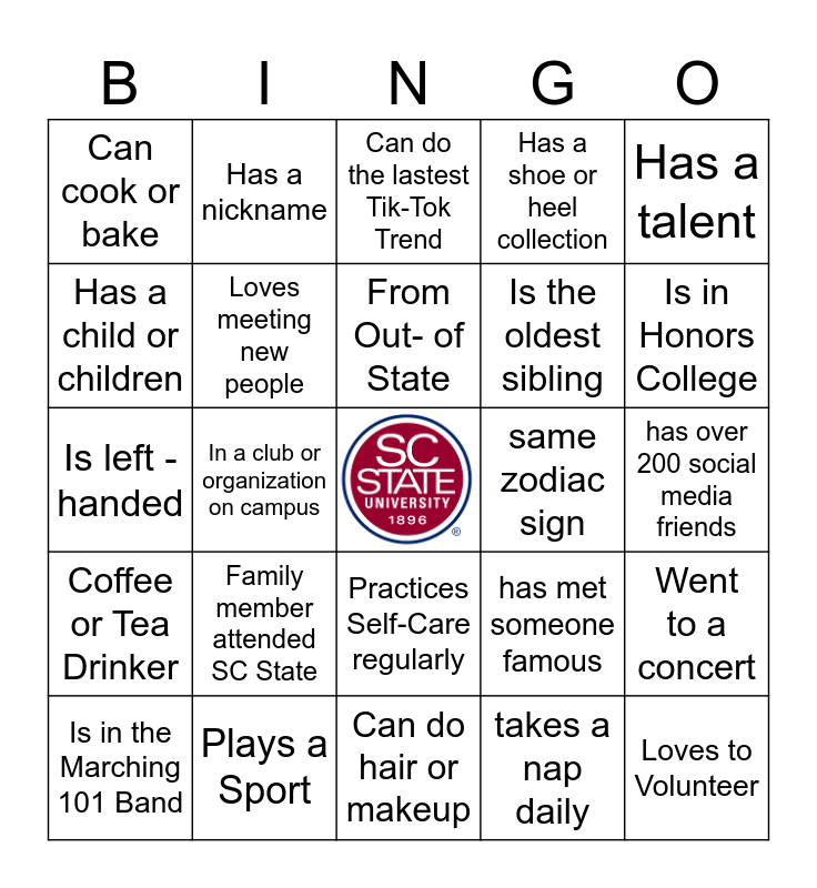 This bingo card has a free space and 24 words: Family member attended SC State, Plays a Sport, From Out- of State, Is in the Marching 101 Band, Has a talent, Can cook or bake, Has a child or children, Has a nickname, same zodiac sign, Practices Self-Care regularly, Is the oldest sibling, Is left -handed, has met someone famous, Went to a concert, Loves meeting new people, takes a nap daily, has over 200 social media friends, Can do the lastest Tik-Tok Trend, Is in Honors College, In a club or organization on campus, Loves to Volunteer, Coffee or Tea Drinker, Has a shoe or heel collection and Can do hair or makeup.