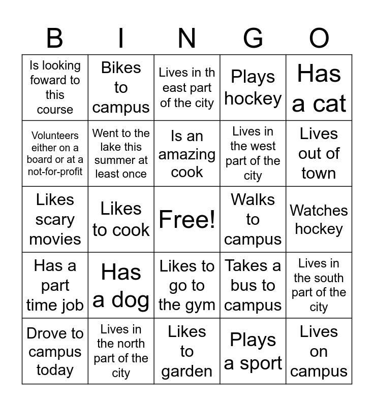 This bingo card has a free space and 24 words: Has a dog, Lives in the north part of the city, Is an amazing cook, Drove to campus today, Has a cat, Is looking foward to this course, Volunteers either on a board or at a not-for-profit, Bikes to campus, Walks to campus, Likes to go to the gym, Lives in the west part of the city, Likes scary movies, Takes a bus to campus, Lives in the south part of the city, Went to the lake this summer at least once, Plays a sport, Watches hockey, Lives in th east part of the city, Lives out of town, Likes to cook, Lives on campus, Has a part time job, Plays hockey and Likes to garden.