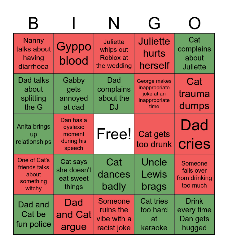 This bingo card has a free space and 24 words: Cat says she doesn't eat sweet things, Dad and Cat argue, Dad complains about the DJ, Dad and Cat be fun police, Cat complains about Juliette, Nanny talks about having diarrhoea, Dad talks about splitting the G, Gyppo blood, Cat gets too drunk, Cat dances badly, George makes inappropriate joke at an inappropriate time, Anita brings up relationships, Uncle Lewis brags, Someone falls over from drinking too much, Gabby gets annoyed at dad, Cat tries too hard at karaoke, Dad cries, Juliette whips out Roblox at the wedding, Cat trauma dumps, Dan has a dyslexic moment during his speech, Drink every time Dan gets hugged, One of Cat's friends talks about something witchy, Juliette hurts herself and Someone ruins the vibe with a racist joke.