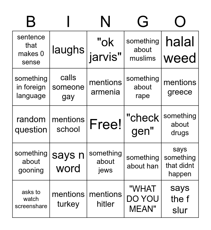 This bingo card has a free space and 24 words: says n word, mentions turkey, mentions armenia, asks to watch screenshare, halal weed, sentence that makes 0 sense, something in foreign language, laughs, "check gen", something about jews, something about rape, random question, something about han, says something that didnt happen, calls someone gay, "WHAT DO YOU MEAN", something about drugs, "ok jarvis", mentions greece, mentions school, says the f slur, something about gooning, something about muslims and mentions hitler.