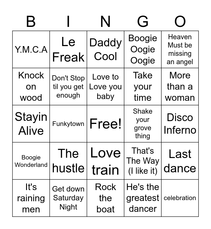 This bingo card has a free space and 43 words: I'm every woman, celebration, I'm so excited, It's raining men, Upside down, He's the greatest dancer, Daddy Cool, Car Wash, Heaven Must be missing an angel, Get down Saturday Night, Boogie Oogie Oogie, Shake your grove thing, Love train, The hustle, Got to be Real, Rock the boat, Turn the beat around, Stayin Alive, Night Fever, More than a woman, Le Freak, Good Times, I will Survive, Y.M.C.A, Dancing Queen, Disco Inferno, Super freak, Get Down Tonight, That's The Way (I like it), Boogie Wonderland, September, Last dance, We are Family, Funkytown, Don't Leave me this way, Ring my bell, Get up, Love to Love you baby, Knock on wood, Take your time, Doube Dutch Bus, Don't Stop til you get enough and Ladies night.