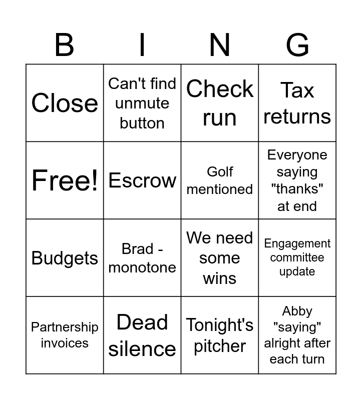 This bingo card has 16 words: Dead silence, Engagement committee update, Check run, Close, Budgets, Can't find unmute button, We need some wins, Tonight's pitcher, Free!, Escrow, Partnership invoices, Tax returns, Brad - monotone, Everyone saying "thanks" at end, Golf mentioned and Abby "saying" alright after each turn.
