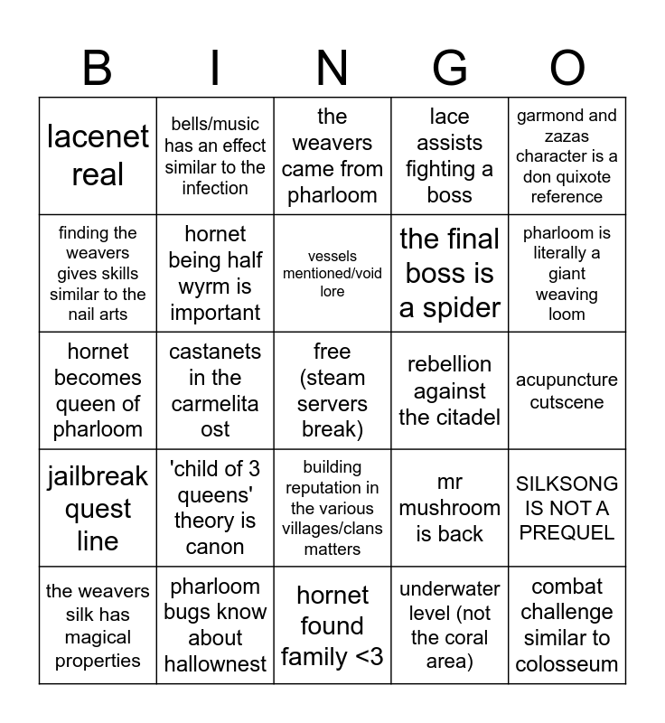 This bingo card has a free space and 24 words: 'child of 3 queens' theory is canon, pharloom bugs know about hallownest, vessels mentioned/void lore, the weavers silk has magical properties, garmond and zazas character is a don quixote reference, lacenet real, finding the weavers gives skills similar to the nail arts, bells/music has an effect similar to the infection, rebellion against the citadel, building reputation in the various villages/clans matters, the final boss is a spider, hornet becomes queen of pharloom, mr mushroom is back, SILKSONG IS NOT A PREQUEL, hornet being half wyrm is important, underwater level (not the coral area), acupuncture cutscene, the weavers came from pharloom, pharloom is literally a giant weaving loom, castanets in the carmelita ost, combat challenge similar to colosseum, jailbreak quest line, lace assists fighting a boss and hornet found family <3.