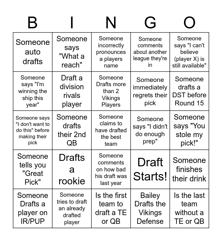 This bingo card has 25 words: Drafts a rookie, Is the first team to draft a TE or QB, Someone Drafts more than 2 Vikings Players, Someone Drafts a player on IR/PUP, Someone says "I can't believe (player X) is still available", Someone auto drafts, Someone says "I'm winning the ship this year", Someone says "What a reach", Someone says "I didn't do enough prep", Someone comments on how bad his draft was last year, Someone immediately regrets their pick, Someone says "I don't want to do this" before making their pick, Draft Starts!, Someone finishes their drink, Draft a division rivals player, Is the last team without a TE or QB, Someone says "You stole my pick!", Someone incorrectly pronounces a players name, Someone drafts a DST before Round 15, Someone drafts their 2nd QB, Someone claims to have drafted the best team, Someone tries to draft an already drafted player, Someone tells you "Great Pick", Someone comments about another league they're in and Bailey Drafts the Vikings Defense.