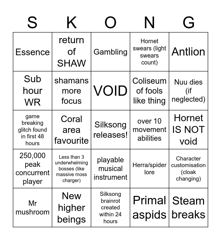 This bingo card has a free space and 24 words: Less than 3 underwhelming bosses (like massive moss charger), New higher beings, VOID, Mr mushroom, Antlion, Essence, Sub hour WR, return of SHAW, over 10 movement abilities, playable musical instrument, Coliseum of fools like thing, game breaking glitch found in first 48 hours, Herra/spider lore, Character customisation (cloak changing), shamans more focus, Primal aspids, Hornet IS NOT void, Gambling, Nuu dies (if neglected), Coral area favourite, Steam breaks, 250,000 peak concurrent player, Hornet swears (light swears count) and Silksong brainrot created within 24 hours.