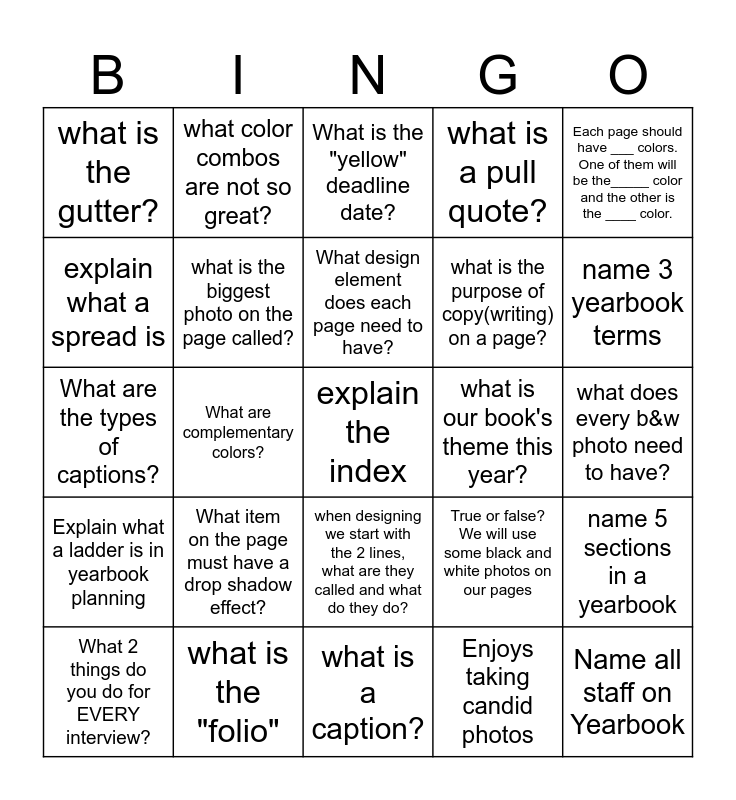 This bingo card has a free space and 25 words: What item on the page must have a drop shadow effect?, what is a caption?, What design element does each page need to have?, What 2 things do you do for EVERY interview?, Each page should have ___ colors. One of them will be the_____ color and the other is the ____ color., what is the gutter?, explain what a spread is, what color combos are not so great?, what is our book's theme this year?, when designing we start with the 2 lines, what are they called and what do they do?, what is the purpose of copy(writing) on a page?, What are the types of captions?, True or false? We will use some black and white photos on our pages, name 5 sections in a yearbook, what is the biggest photo on the page called?, What is a tripod?, what does every b&w photo need to have?, What is the "yellow" deadline date?, name 3 yearbook terms, What are complementary colors?, Name all staff on Yearbook, what is the "folio", Explain what a ladder is in yearbook planning, what is a pull quote? and Enjoys taking candid photos.