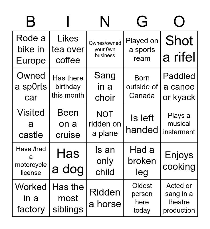 This bingo card has 25 words: Has a dog, Ridden a horse, Sang in a choir, Worked in a factory, Shot a rifel, Rode a bike in Europe, Owned a sp0rts car, Likes tea over coffee, Is left handed, Is an only child, Born outside of Canada, Visited a castle, Had a broken leg, Enjoys cooking, Has there birthday this month, Acted or sang in a theatre production, Plays a musical insterment, Ownes/owned your 0wn business, Paddled a canoe or kyack, Been on a cruise, NOT ridden on a plane, Has the most siblings, Have /had a motorcycle license, Played on a sports ream and Oldest person here today.