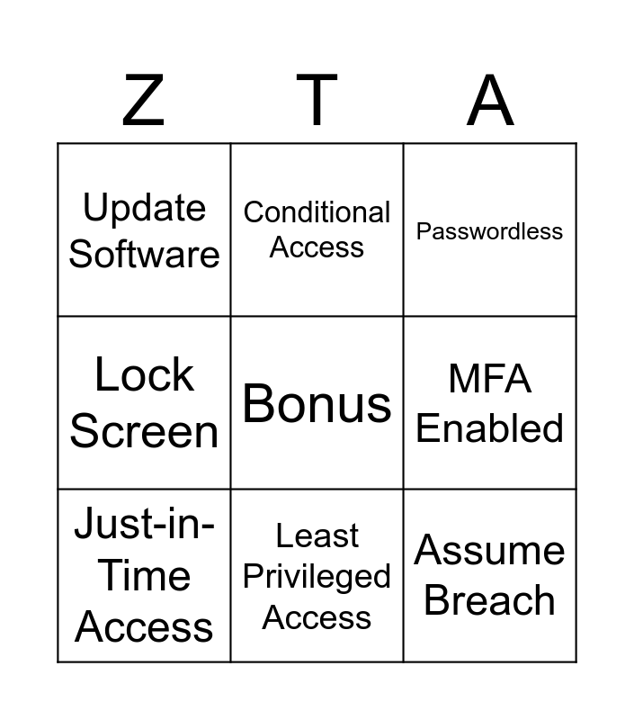 This bingo card has a free space and 11 words: Trust but Verify, Least Privileged Access, Assume Breach, Just-in-Time Access, Conditional Access, Passwordless, MFA Enabled, Encrypt Everywhere, Lock Screen, Update Software and Report Phishing.