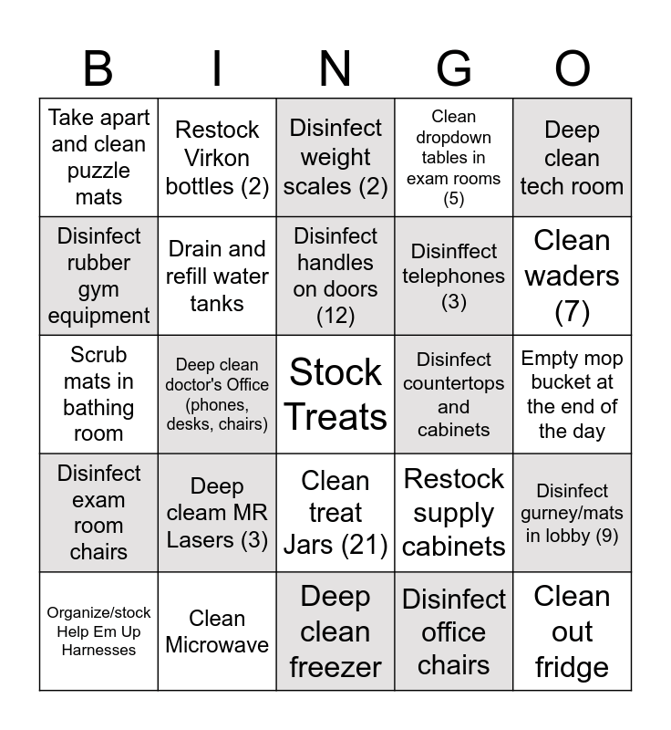 This bingo card has a free space and 24 words: Deep cleam MR Lasers (3), Clean Microwave, Disinfect handles on doors (12), Organize/stock Help Em Up Harnesses, Deep clean tech room, Take apart and clean puzzle mats, Disinfect rubber gym equipment, Restock Virkon bottles (2), Disinfect countertops and cabinets, Clean treat Jars (21), Disinffect telephones (3), Scrub mats in bathing room, Restock supply cabinets, Disinfect gurney/mats in lobby (9), Drain and refill water tanks, Disinfect office chairs, Empty mop bucket at the end of the day, Disinfect weight scales (2), Clean waders (7), Deep clean doctor's Office (phones, desks, chairs), Clean out fridge, Disinfect exam room chairs, Clean dropdown tables in exam rooms (5) and Deep clean freezer.