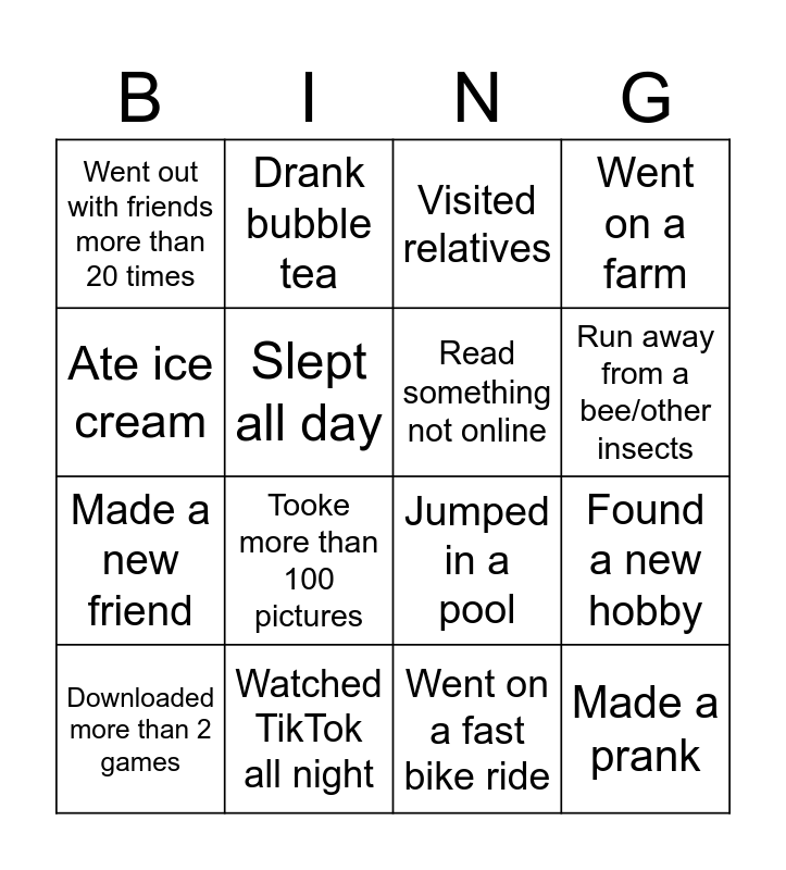 This bingo card has 16 words: Watched TikTok all night, Found a new hobby, Visited relatives, Went out with friends more than 20 times, Made a new friend, Drank bubble tea, Jumped in a pool, Went on a fast bike ride, Ate ice cream, Slept all day, Downloaded more than 2 games, Went on a farm, Tooke more than 100 pictures, Run away from a bee/other insects, Read something not online and Made a prank.