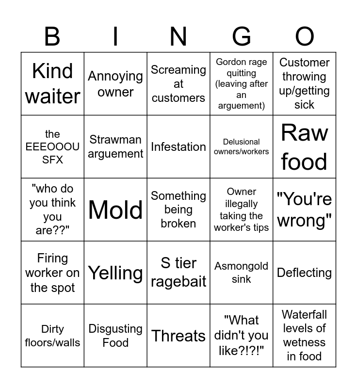 This bingo card has a free space and 24 words: Yelling, Disgusting Food, Infestation, Dirty floors/walls, Customer throwing up/getting sick, Kind waiter, the EEEOOOU SFX, Annoying owner, Owner illegally taking the worker's tips, S tier ragebait, Delusional owners/workers, "who do you think you are??", Asmongold sink, Deflecting, Strawman arguement, "What didn't you like?!?!", "You're wrong", Screaming at customers, Raw food, Mold, Waterfall levels of wetness in food, Firing worker on the spot, Gordon rage quitting (leaving after an arguement) and Threats.