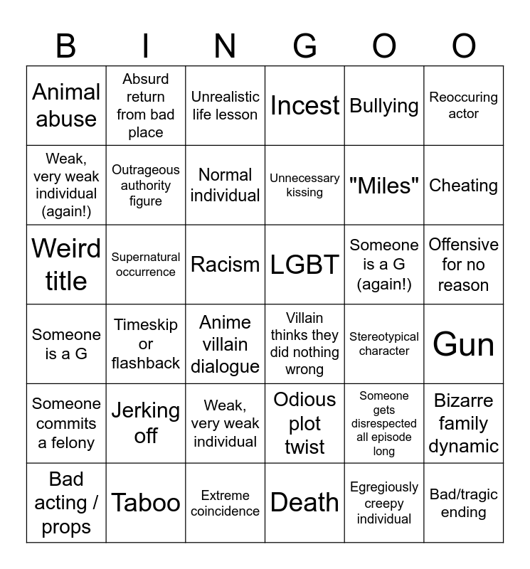 This bingo card has 36 words: Odious plot twist, Weak, very weak individual, Death, Weak, very weak individual (again!), Someone is a G, LGBT, Outrageous authority figure, Extreme coincidence, Bullying, Someone gets disrespected all episode long, Cheating, Incest, Bizarre family dynamic, Supernatural occurrence, Unnecessary kissing, Animal abuse, Someone commits a felony, Someone is a G (again!), Weird title, Unrealistic life lesson, Racism, Timeskip or flashback, Villain thinks they did nothing wrong, Anime villain dialogue, Stereotypical character, Absurd return from bad place, "Miles", Taboo, Normal individual, Reoccuring actor, Bad/tragic ending, Bad acting / props, Gun, Offensive for no reason, Jerking off and Egregiously creepy individual.